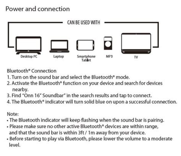 Select the Bluetooth search function on your device. Your device should discover the soundbar which is called “Onn 36” 5.1 soundbar “. Select “Onn 36″ 5.1 soundbar”. your device is paired with the soundbar when the blue indicator light stops flashing and becomes solid. Connect the AC IN port to the power outlet by power cable.