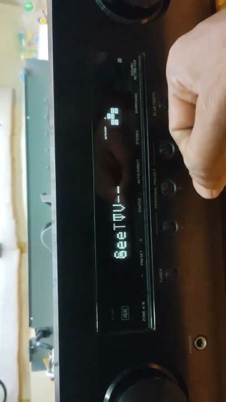 Switch the receiver into standby mode by holding down “Band” and then pressing and holding the “Standby/On” button for about two seconds. When you see “Reset?” appear on the display, press either the left or right arrow button or the “Auto Surround/Stream Direct” button until “OK?” is displayed.