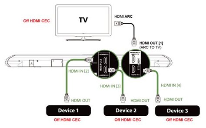 Connect the other side to the HDMI 1 port on the TV’s back: This enables Samsung TVs to transmit audio signals. Connect the Vizio soundbar to power: Connect the Power port to the power cable on the Vizio sound bar’s back. Select “HDMI”: Use the sound bar’s remote to select “HDMI” as the input method.