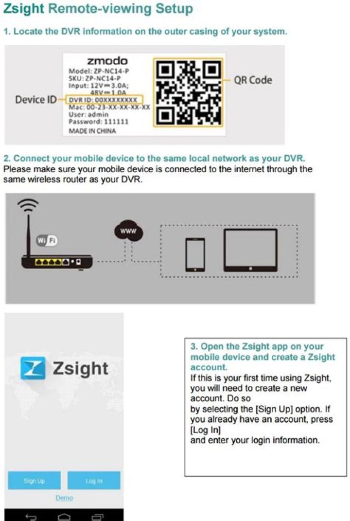 1. Download”Zsight”App from Google Play or App Store on your mobile device; 2. Connect your mobile device to the same local network as your NVR. Please make sure your mobile device is connected to the internet through the same wireless router as your NVR; 3. Open the Zsight app on your mobile device and create a Zsight account.