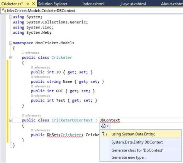 You should have an MVC 5 application for working in it. Step 1: Go to Solution Explorer and select your app. Step 2: Right-click on Model and select go “Add” then “Class”. Step 3: Enter your class name. You can see your new class as in the following: After adding the class in the Model, let’s add some properties: