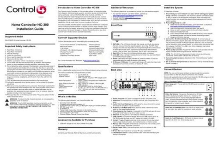 To install this controller: 1. Ensure that your home network is in place before starting your system setup:The Home Controller HC-300 requires a network connection (wired or WiFi) in order to use all features as designed. When connected, the Home Controller can access Web-based media databases and Control4 system updates. 2.
