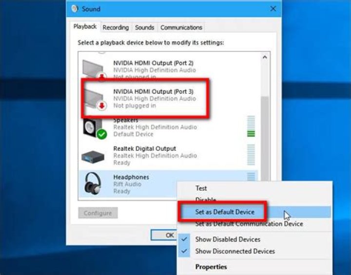 Set your HDMI device as the default audio device. 1 Right-click on the volume icon on the taskbar. 2 Click ‘Playback devices’. The sound window will open. 3 On the ‘Playback’ tab, select HDMI or your digital output device. 4 Set the option as default. See More….
