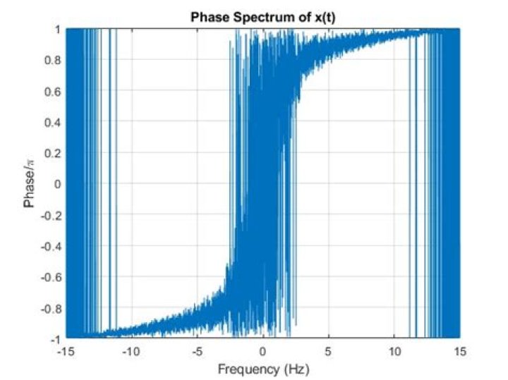 The recomputed phase spectrum is plotted below. The phase spectrum has correctly registered the phase shift at the frequency . The phase spectrum is anti-symmetric ( at ), which is expected for real-valued signals. Reconstruction of the time domain signal from the frequency domain sample is pretty straightforward