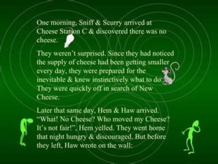 Who Moved My Cheese a parable about two little people and two mice in a maze, searching for cheese, where each character represents a different attitude towards change, with cheese being what we consider success. You can always find new cheese, and the minute you start moving things will get better.