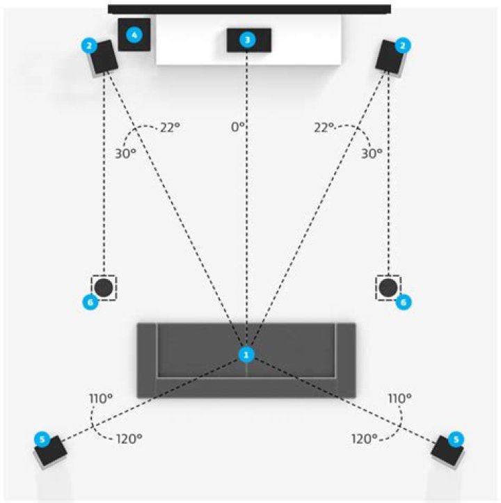 Just like in a 5.1 setup, the side speakers are placed to the left and right of your seating position and face directly towards you. The rear speakers are positioned behind you, facing forward. Position both pairs of speakers one to two feet above ear level for best performance.