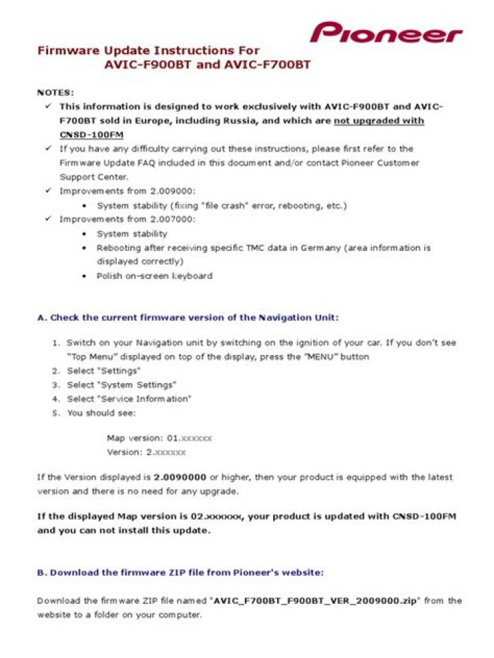 If an incorrect firmware is used, the product will no longer function correctly. This firmware is only for AVIC-F700BT and AVIC-F900BT which are updated with CNSD-200FM (map version 03) sold in Europe, excluding Russia. 1. Switch on your Navigation unit by switching on the ignition of your car.