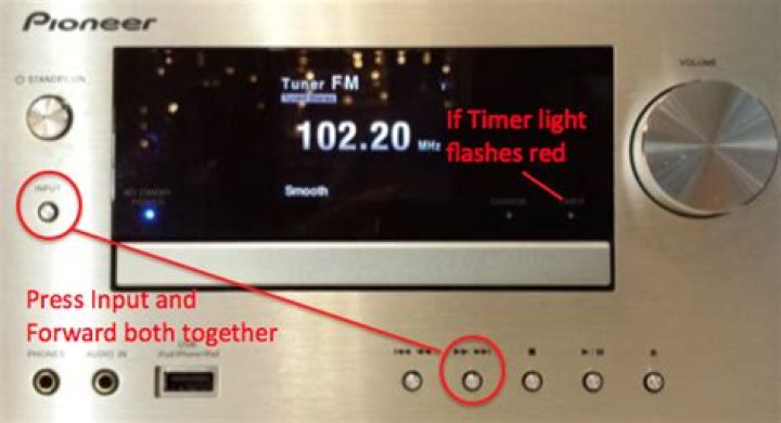 Plug the power cord back into the electrical wall outlet. Press the power button to turn on the stereo system. Press and hold the STOP button and folder minus button at the same time until the word RESET appears on the display panel. Was this answer helpful? Hello my pioneer av receiver 834 purchased a month back why does it gets shut down?